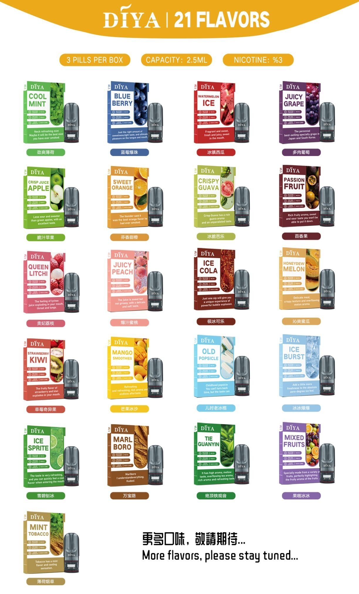 煙彈外殼採用食品級材料製成,安全無毒,耐用性高。每盒包含三顆煙彈,適合日常使用或備用需求,讓您隨時享受不間斷的體驗。無論是替換舊煙彈還是嘗試新選擇,DIYA 叮啞煙彈都能滿足您的期望,帶來流暢且經濟實惠的解決方案。
